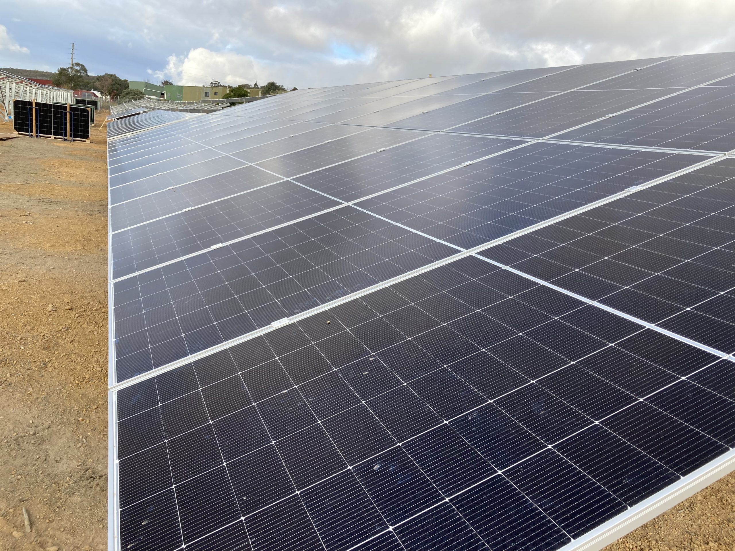 Work is rushing by – if you are on a train going to Sydney. With contractors speeding along with concreting in the poles, attaching the racking and now installing the panels, all will be ready to start wiring up the lines of panels by the end of May. Check out the video of the site under construction